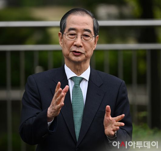 아시아투데이 송의주 기자 = 한덕수 무소속 대선 예비후보가 8일 오후 서울 여의도 국회 강변서재에서 김문수 국민의힘 대선 후보와 단일화 관련 회동을 마친 뒤 언론 브리핑을 하고 있다. ⓒ "젊은 파워, 모바일 넘버원 아시아투데이"