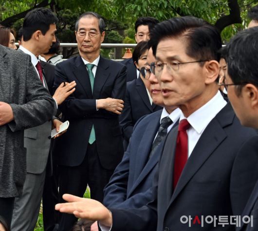 아시아투데이 송의주 기자 = 한덕수 무소속 대선 예비후보가 8일 오후 서울 여의도 국회 강변서재에서 김문수 국민의힘 대선 후보의 단일화 관련 언론 브리핑을 바라보고 있다. ⓒ "젊은 파워, 모바일 넘버원 아시아투데이"
