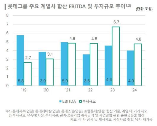 여기에다 들어간 돈에 견줘 벌어들이는 돈은 이에 미치지 못하고 있는 점도 한신평이 주목하는 대목이다. 그룹계열사 합산 신규투자 규모는 2022년 4조8천억원, 2023년 6조7천억원, 2024년 4조8천억원에 이른다. 이 기간 그룹 전체 계열사가 벌어들인 상각 전 영업이익(3조6천억~4조6천억원)을 크게 웃돈다. 한신평은 “2022년 이후 롯데케미칼 중심으로 화학 및 2차 전지 부문(일진머티리얼즈 인수)에 대규모 자본투자를 실행했으나 두 부문 모두 기나긴 업황 부진이 이어지고 있고 향후 개선될 거라는 기대도 난망”이라고 평가했다.