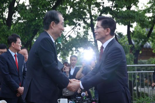 앞서 같은 날 오전 김 후보는 일주일가량 선거운동을 한 뒤 내주 TV토론과 여론조사를 진행하자고 제안했다. 하지만 국민의힘은 정해놓은 로드맵에 따라 이날 오후부터 당원과 일반 국민을 대상으로 후보 선호도 조사를 시작했다. 국민의힘은 이 결과를 토대로 김 후보에 대한 단일화 압박 수위를 한층 끌어올릴 것으로 보인다. 한 전 총리는 ‘당 지도부의 자체 진행을 어떻게 보느냐’는 물음에 “그 문제는 판단하지 않겠다”고 말을 아꼈다. ‘국민의힘 지도부와 연락을 주고받냐’는 질문에는 “경선과정에 영향을 줄 수 있는 일은 하지 않는다”고 했다.