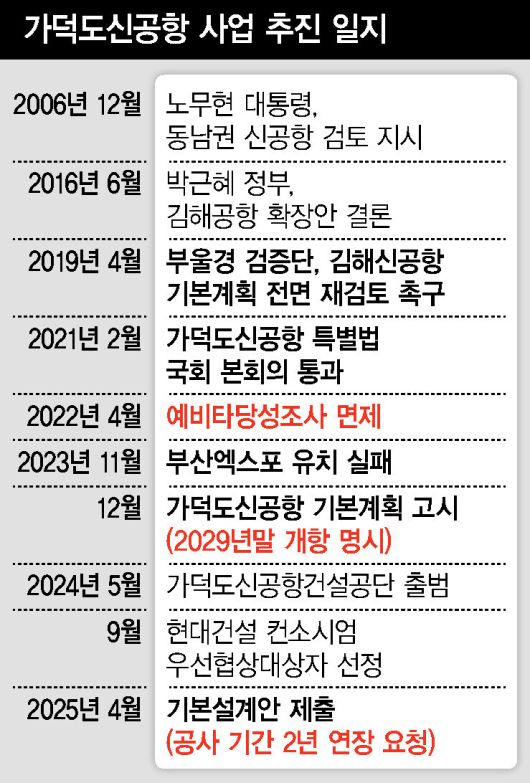 업계 안팎에선 2029년 말 개항하고, 2032년 준공하는 국토부 계획은 애초 무리였다는 평가가 많다. 문재인 정부 당시 국토부 의뢰로 진행한 ‘가덕도신공항 사전타당성 검토 연구용역’에서 개항 목표 시기는 2035년이었다. 그러나 윤석열 정부 들어 2023년 12월 고시된 ‘가덕도신공항 건설 기본계획’에서는 공항 개항 시기가 2029년 말로 5년 앞당겨졌다. ‘2030 부산엑스포’ 유치에 맞춰 개항 시기를 앞당긴 것이다.
