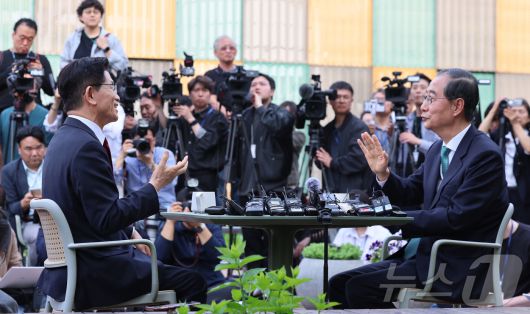 (서울=뉴스1) 김민지 기자 = 김문수 국민의힘 대통령 후보와 한덕수 무소속 대선 예비후보가 8일 서울 여의도 국회 강변서재에서 '후보 단일화' 회동을 하고 있다.(공동취재) 2025.5.8/뉴스1
