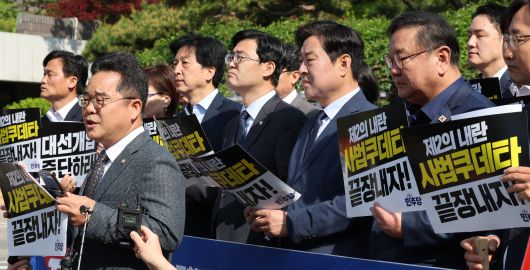 더불어민주당 정무위·기재위 소속 의원들이 7일 오전 서울 서초구 서울고등법원 앞에서 '조희대 대법원 대선개입 저지 기자회견'을 열고 이재명 민주당 대통령 후보에 대한 파기환송심 결정을 규탄하고 있다. /뉴스1 |