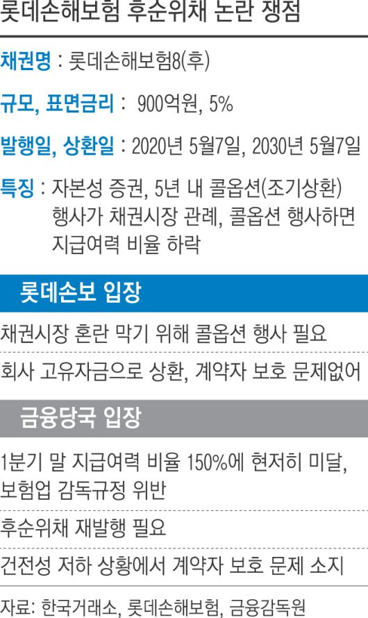 롯데손해보험(롯데손보)이 8일 자사 후순위 채권의 ‘콜옵션(미리 살 수 있는 권리·조기상환권)’을 강행하겠다는 뜻을 밝히자 금융당국은 ‘심각한 우려’를 표명하고 나섰다. 롯데손보는 금융시장 충격을 고려한 불가피한 선택이라는 입장이지만 금융당국은 규정을 위반했다며 롯데손보의 재무상황 평가 결과가 확정되는 대로 상응하는 조치를 하겠다고 밝혔다.