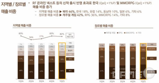 1분기 국가별 매출 비중은 북미 46%, 한국 18%, 유럽 14%, 동남아 10%, 일본 6%, 기타 6% 순으로 집계됐다. 장르별 매출 비중은 캐주얼 게임 42%, RPG 36%, MMORPG 14%, 기타 8%로 'RF 온라인 넥스트'의 출시 효과가 소폭 반영되어 국가별로는 한국이, 장르에서는 MMORPG가 전 분기 대비 성장했다.