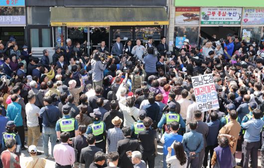 “이러면 안 됩니다. 다칩니다.” 경호원들이 소리쳤다. 이들은 동두천 옛 성병관리소 철거 저지를 위한 공동대책위원회에서 나온 활동가들이었다. ‘이재명 후보님 기지촌 여성의 아픔을 기억해 주세요’, ‘동두천시는 성병관리소를 유산으로 보존하고 역사문화·평화공원으로 활용하라’는 손팻말이 보였다. 이 후보가 경호원을 제지하고 약 10초 동안 서서 이들의 말을 들었다. “기지촌 여성들을 강제수용하던 성병관리소를 한 번 꼭 들려주세요. 저희는 이걸 꼭 지켜야 합니다.” 활동가들이 말했다. 이 후보는 30초 정도 이들에게 무언가 이야기하고 자리를 떠났다.