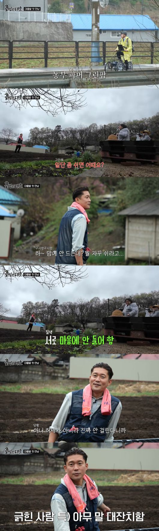 이날 공개된 첫 화에서 김대호는 밭갈이를 마친 후 바로 비닐 작업에 나서려고 했다.