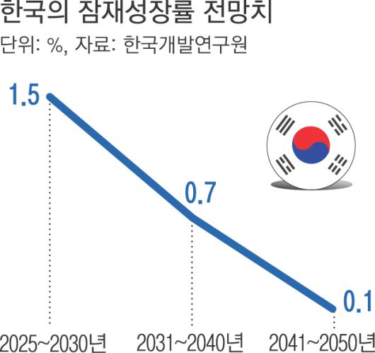 국책 연구기관인 한국개발연구원(KDI)이 빠른 속도로 진행되는 인구 고령화로 인해 한국 잠재성장률이 15년 뒤부터는 0.1%까지 내려갈 수 있다고 전망했다. KDI가 3년 전 발표한 전망치보다 크게 떨어진 수치로 한국은행 전망치(0.7%)보다도 상당히 낮은 수준이다. KDI는 잠재성장률을 높이기 위해 생산성이 높은 혁신기업이 생길 수 있도록 진입장벽을 낮추고, 일·가정 양립 등을 통해 노동력 감소에 대응해야 한다고 강조했다.