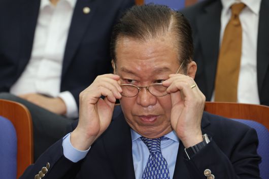 국민의힘 권영세 비상대책위원장이 8일 서울 여의도 국회에서 열린 의원총회에서 안경을 고쳐쓰고 있다. 연합뉴스 |
