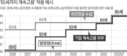 올해 입법을 전제로 계속고용 의무 적용 시기는 2027년까지 2년 유예한 뒤 2028~2029년 62세, 2030~2031년 63세, 2032년 64세, 2033년 65세로 단계적으로 연령을 올릴 것을 제안했다. 이렇게 되면 국민연금 수급과 계속고용 의무 연령 간 차이가 점차 줄어 2033년에는 65세로 같아진다.