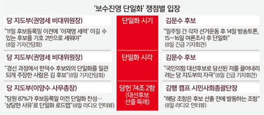 한 후보는 김 후보가 단일화를 약속하고도 의지가 없다고 비판했다. 한 후보는 “1주일 뒤에 (단일화를) 하자는 건 하지 말잔 얘기랑 똑같다고 본다”며 “당장 오늘내일 결판을 내자. 모든 방법은 당에서 하라는 대로 다 받겠다”고 압박했다. 이어 그는 “국민의 명령에 가까운 희망을 볼 때 (단일화를) 미루는 건 예의가 아니다”라며 “시간이 없다. 어떤 절차도 어떤 방식도 좋다”고 강조했다.