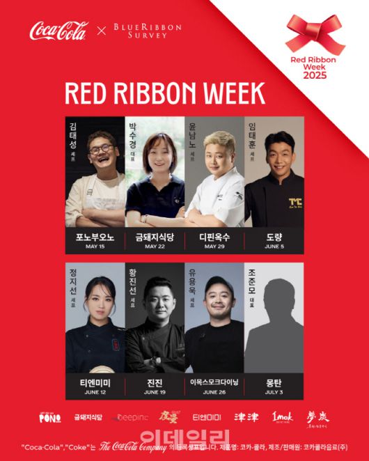 ‘레드리본 위크 2025’는 코카-콜라가 블루리본 서베이와 함께 기획한 단독 미식 이벤트로, 매주 목요일마다 ‘2025 레드리본 전국의 맛집’ 리스트 중 최근 선풍적인 인기를 얻고 있는 8곳의 유명 레스토랑과 연계해 진행된다.