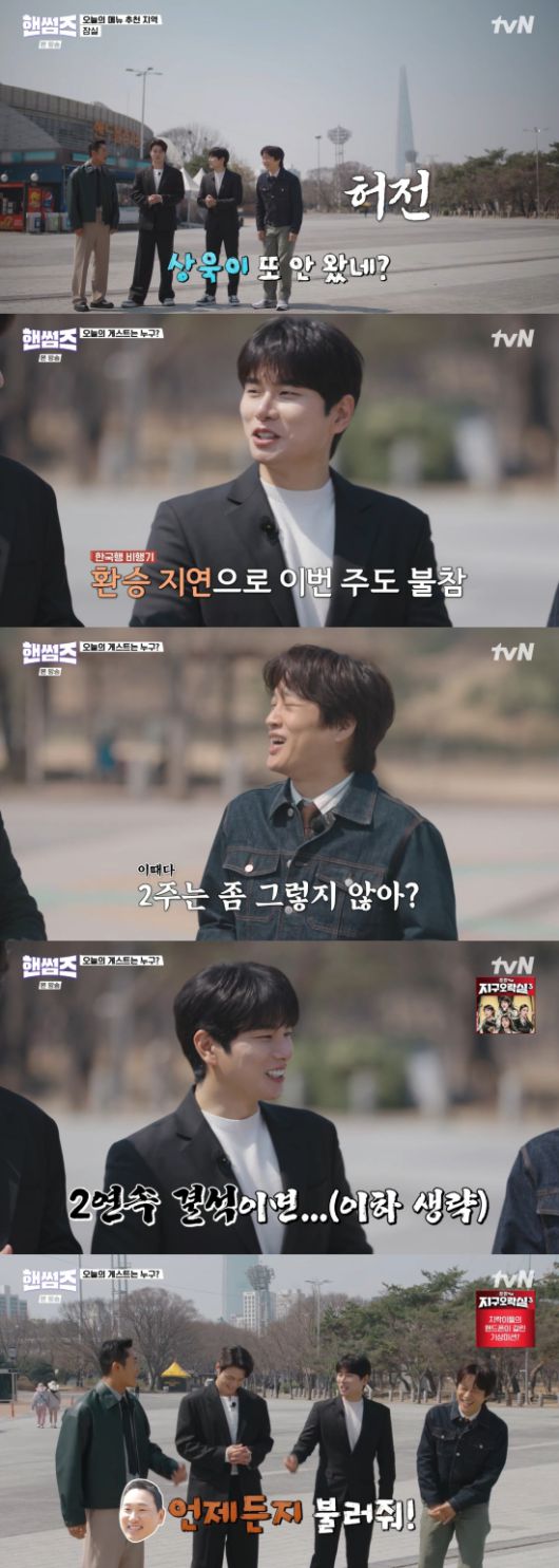 이이경은 "상욱이가 경기는 끝났는데 오는 비행기가 갈아타는 환승이 비행기가 늦어져서"라며 전했다.