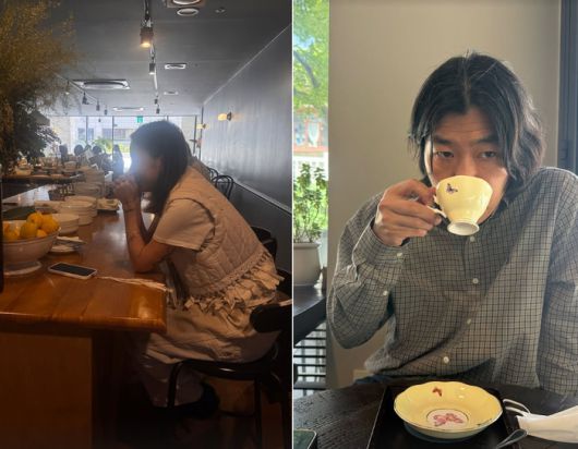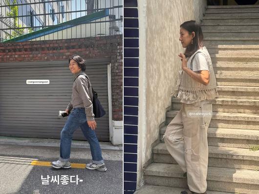 사진에서 이효리는 내추럴한 스타일의 베이지 컬러 베스트와 와이드 팬츠, 반팔 티셔츠를 매치해 편안하면서도 감각적인 패션을 선보였다. 이효리는 카페에서 차분하게 앉아 대화를 나누거나, 야외 계단에서 자연스럽게 포즈를 취하며 일상의 여유를 만끽하는 모습이다.