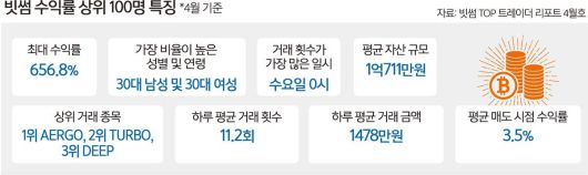 투자 경향을 살펴보면 수익률 상위 100명은 하루 평균 11.2회, 1478만원을 거래했고 전체 주문의 91%는 지정가 주문 방식으로 이뤄졌다. 가상자산의 개별 수익률이 평균 3.5%에 도달했을 때 매도하는 경향을 보였다. 이들이 4월 한 달 동안 가장 많이 거래한 종목은 아르고(AERGO)였고, 이어 터보(TURBO)와 딥북(DEEP) 순이었다.