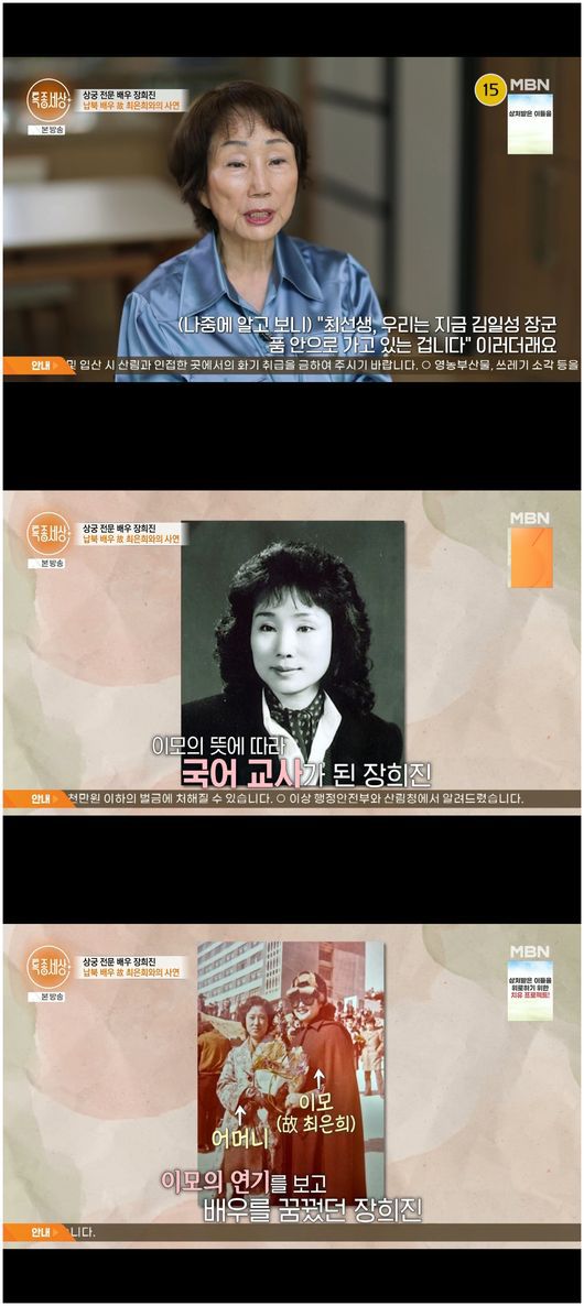 장희진은 “우리 이모하고 이모부가 북한에서 탈출할 적에 오스트리아 빈에서 탈출할 때 미국으로 망명하셨다. 故 신상옥 감독과 배우 故 최은희가 저희 이모부랑 이모다”라면서 “이모가 아기를 못 낳았는데 여자 조카로 내가 처음 태어나자 나를 너무 예뻐했다더라. 제가 컸을 때도 업고 다니고, 조카여도 큰 조카니까 이야기도 많이 했다”라며 각별할 수밖에 없는 이유를 밝혔다.