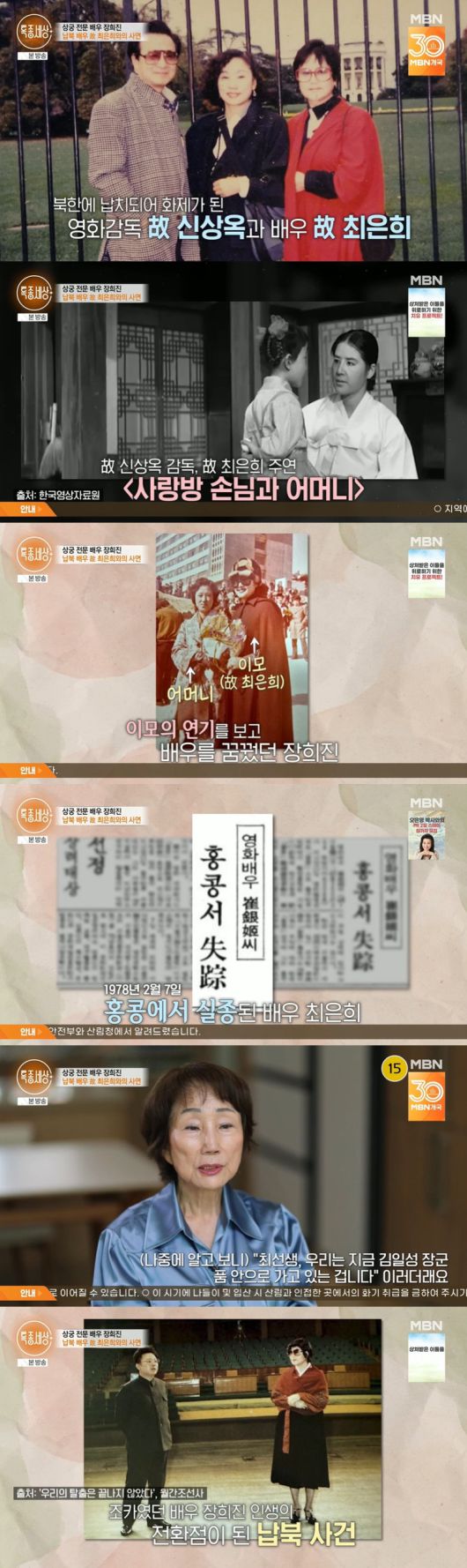 8일 방송된 MBN '특종세상'에서는 배우 장희진이 출연해 납북 배우이자 자신의 이모인 故 최은희를 향한 그리움을 드러냈다.