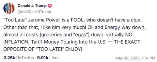트럼프 대통령은 이날 본인 트루스소셜 계정에 “나는 ‘너무 늦는(Too Late)’ 제롬 파월을 좋아하지만, 아무것도 모르는 바보”라며 파월 의장을 비꼬았다.