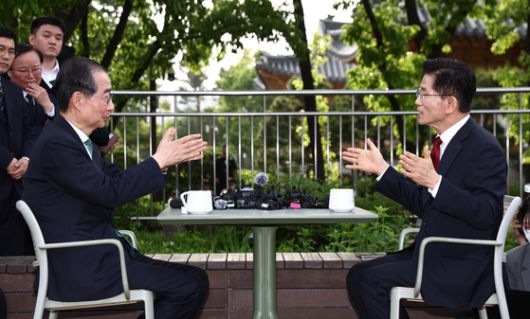 국민의힘 김문수 대선후보와 무소속 한덕수 대선 예비후보가 8일 서울 국회 사랑재에 위치한 커피숍에서 만나 회동하고 있다. 연합뉴스 |