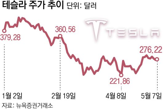 주가 하락이 이어지는 데다 최근 원-달러 환율 급락으로 환 손실 위험까지 커지면서 국내 투자자들의 불안감도 커지고 있다. 하장권 현대차증권 연구원은 “테슬라의 주가가 400달러를 넘은 것은 미 대선 때 정치 테마주로 엮였던 영향이 있는 만큼 단기에 고점을 회복하긴 어려울 것”이라며 “전기차 관련 매출이 살아나기 전까지는 횡보세를 보일 가능성이 크다”고 말했다.