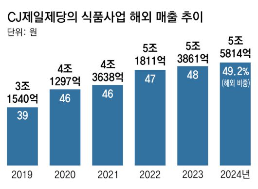 CJ제일제당은 대표 제품인 ‘비비고 왕교자’가 연간 1조1000억 원 규모의 일본 냉동만두 시장에서 일본인들이 선호하는 만두 종류인 ‘교자’와 비슷하다는 점을 기회로 보고 있다. 일본에서 CJ제일제당은 비비고 만두, 냉동김밥, K소스 등을 이온, 코스트코, 아마존, 라쿠텐 등 주요 유통채널을 통해 판매하고 있다. 일본을 포함한 CJ제일제당의 해외 식품사업 매출은 2019년 3조1540억 원에서 지난해 5조5814억 원으로 77% 증가했다. 같은 기간 전체 식품 매출에서 해외 매출 비중은 39%에서 49%로 늘었다.