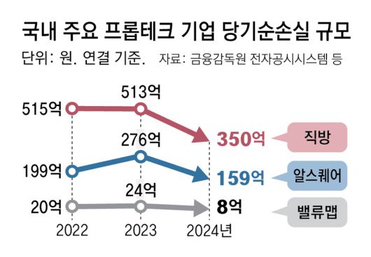 투자 감소 원인으로는 프롭테크 기업들의 실적 악화가 거론된다. 금융감독원 전자공시 시스템에 따르면 지난해 직방 매출액은 연결 기준 1014억 원으로 전년(1297억 원) 보다 21.8% 감소했다. 2010년 설립 이후 처음으로 매출액이 줄어든 것이다. 지난해 순손실액은 350억 원으로 2021년(130억 원) 이후 4년째 적자를 면치 못하고 있다.