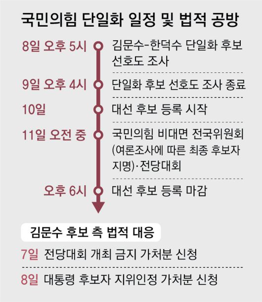 김 후보는 당 주도의 단일화 착수에 법적 대응으로 맞섰다. 김 후보는 이날 서울남부지법에 대통령 후보자 지위를 확인하는 취지의 가처분 신청을 했다. 국민의힘 대선 후보 지위를 제3자에게 부여할 수 없도록 하기 위한 의도다. 앞서 김 후보 측 원외당협위원장들이 전날 국민의힘이 공고한 전국위원회와 전당대회 개최를 막아 달라며 가처분 신청을 낸 데 이어 김 후보가 직접 나선 것이다. 법원의 가처분 결정은 이르면 9일 나올 수 있다는 관측이 나온다.