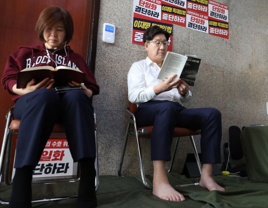 단일화 촉구 단식 농성 국민의힘 대선 후보 단일화를 촉구하며 이틀째 단식 농성 중인 국민의힘 권성동 원내대표(오른쪽)와 김미애 의원이 8일 오전 서울 여의도 국회 원내대표실 앞에서 책을 읽고 있다. 뉴시스 |