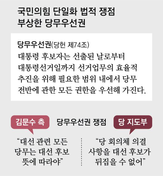 김 후보와 국민의힘 지도부는 당무우선권에 대한 해석을 두고도 충돌을 거듭했다. 김 후보는 이날 관훈클럽 토론회에서 “대선 후보가 된 사람은 선거 관련 모든 부분에서 우선적인 권한을 가지게 돼 있다”고 주장했다. 하지만 당 지도부는 “당무우선권이 비상대권은 아니다”라는 입장이다. 국민의힘 이양수 사무총장은 “지금은 민주 정당인데, 각 위원회(회의체)에서 결정한 사항들을 대선 후보라 할지라도 함부로 못 고친다”고 말했다.