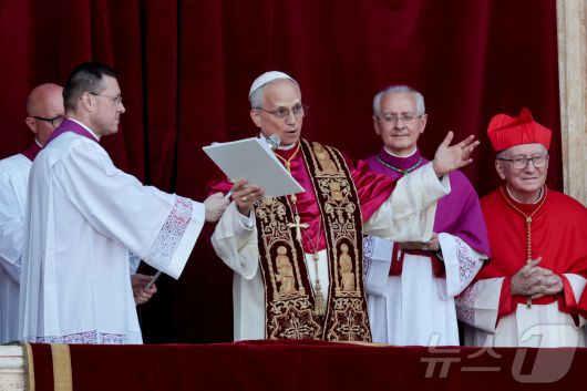 제267대 교황으로 선출된 레오 14세 교황(로버트 프리보스트 미국 추기경)이 8일(현지시간) 바티칸 성 베드로 대성당 로지아 발코니에 등장해 전 세계인에게 라틴어 '우르비 에트 오르비(Urbi et Orbi·로마와 전 세계에)'라는 첫 사도적 축복을 내리고 있다. ⓒ 로이터=뉴스1