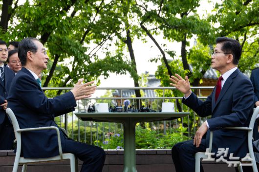 8일 오후 국민의힘 김문수 대선 후보와 한덕수 예비후보가 국회 사랑재 카페에서 공개회동을 하고 있다. 황진환 기자 |