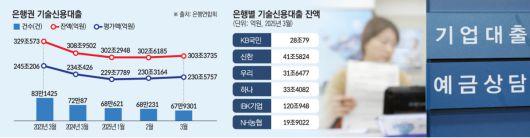 올해 3월 말 기준 기술신용대출 잔액은 303조3735억 원으로 전월(302조6185억 원) 대비 늘었다. 그러나 세부적으로 보면 국책은행인 IBK기업은행이 대부분 끌어올렸다. 기술신용대출 상품을 취급하는 5개 시중은행(국민·신한·하나·우리·SC제일)의 대출 잔액은 되레 줄고 있는 것으로 나타났다.