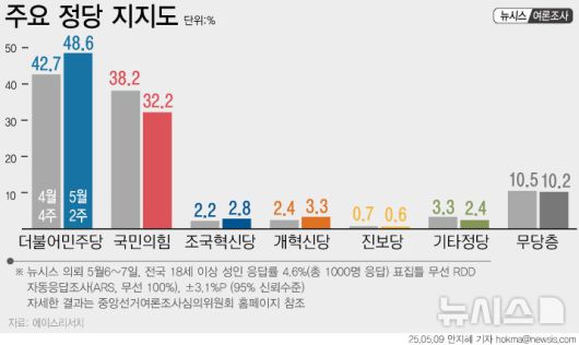 뉴시스 의뢰로 에이스리서치가 지난 6~7일 이틀간 전국에 거주하는 만 18세 이상의 성인 남녀 1000명을 대상으로 실시한 정당 지지도 조사 결과 더불어민주당의 지지도는 48.6%, 국민의힘의 지지도는 32.2%를 기록했다.