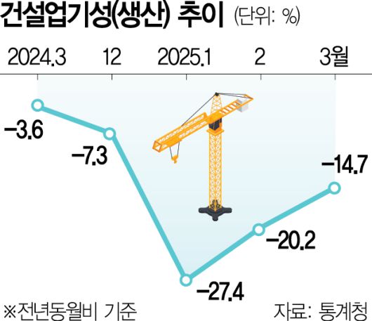 건설업 분야는 최근 들어 지속적인 하락세를 보이고 있다. 이달 5일 통계청이 발표한 ‘2025년 3월 산업활동동향’에 따르면 건설업 생산은 지난해 2분기 전년 동월 대비 -3.1% 감소한 후 같은 해 3분기(-9.1%), 4분기(-9.7%)에 이어 올해 1분기(-20.7%)까지 꾸준히 감소하고 있다.