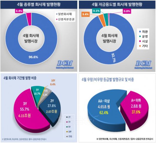 신용등급별 발행에서는 우량등급(AA- 이상)이 4조 6500억 원으로 전체의 62.4%를 차지했다. 이는 2월(75.3%)과 3월(73.8%)보다는 하락한 수치로, 상대적으로 신용도 낮은 발행사의 시장 진입이 활발해졌음을 보여준다.