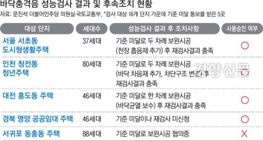 문 의원은 “층간소음 방지 성능이 기준치에 미달했는데도 사용승인이 난 사례가 이미 나온 만큼, 기준에 미달한 공동주택은 사용승인 전에 보완시공을 반드시 거치도록 법제화할 필요성이 있다”고 지적했다.