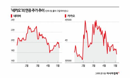 반면 IT 대장주들은 빛을 보지 못했다. 카카오의 경우 지난 1분기 연결 기준 매출액과 영업이익이 각각 1조8637억원, 1054억원으로 전년 동기 대비 각각 6%, 12% 감소했다. 특히 뮤직과 게임 부문의 부진으로 콘텐츠 부문 매출액이 16% 줄어든 게 크게 작용했다. 임희석 미래에셋증권 연구원은 "콘텐츠 부문의 부진이 깊어지고 있어 올해 유의미한 실적 반등을 기대하긴 어렵다"며 목표주가를 5만4000원에서 5만원으로 하향했다.