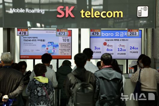 [인천공항=뉴시스] 김명년 기자 = 29일 오전 인천국제공항 제1여객터미널 SK텔레콤 로밍센터에서 출국자들이 유심 교체을 위해 대기하고 있다. 2025.04.27. kmn@newsis.com