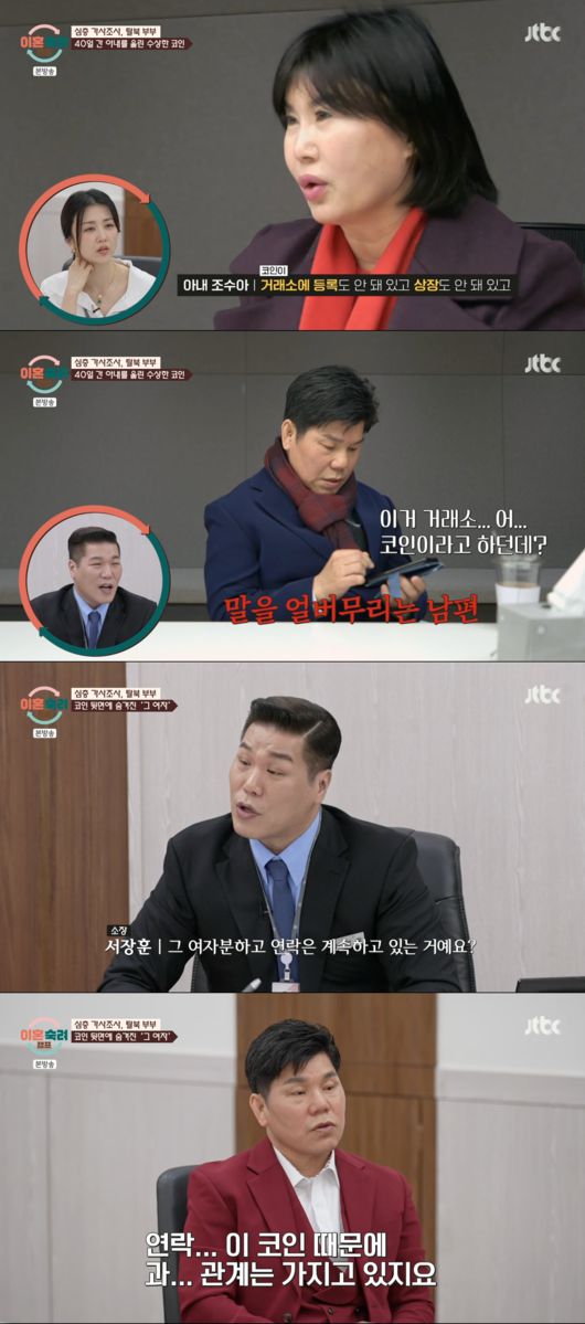 투자 및 코인의 돈이 5억이 넘느냐는 말에 아내는 더 넘는다고 했지만, 남편은 아니라고 반박했다. 심지어 코인을 소개해준 사람에는 남편이 아는 여자가 끼어있다고. 남편은 코인 때문에 그 여자와 계속 연락을 하고 있다고 밝혔다.