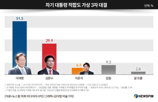 [그래픽] 차기 대통령 적합도 가상 3자 대결 이재명vs김문수vs이준석