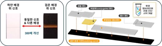 배경에 따른 신호세기 비교(왼쪽), 검은 배경 기반의 신속항원진단 키트 구조(오른쪽). |