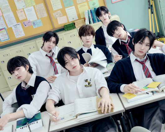 사진 속 일곱 멤버는 교실에 나란히 앉거나 벽에 기댄 채 깊이 있는 눈빛으로 카메라를 응시해 시선을 붙잡았다. 단정한 스쿨룩 스타일링과 교과서, 필기구 등 다양한 소품이 풋풋한 하이틴 감성을 더했다.