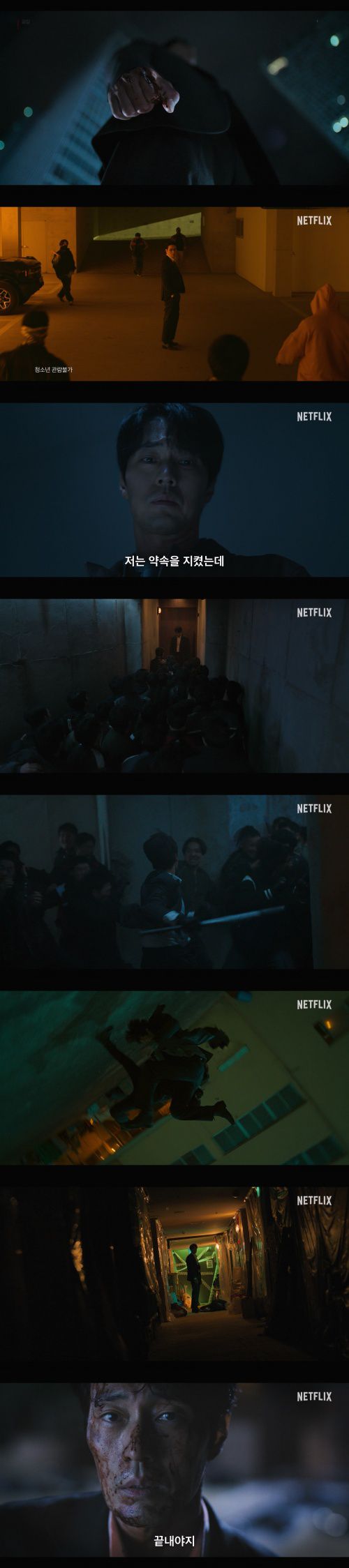 살기 위해, 그로부터 도망가기 위해 닫힌 문을 두드리는 사람들을 끝까지 바라보는 ‘기준’과 총을 쏘는 상대조차 피하지 않고 계속해서 다가오는 그의 모습은 오로지 복수만을 위해 나아가는 ‘기준’의 피도 눈물도 없는 차가운 모습을 예고하며 긴장감을 배가시킨다. 마지막으로 피투성이가 된 채 “끝내야지, 전부 다”라고 말하는 ‘기준’의 모습은 그의 고독했던 여정 끝에 무엇이 기다리고 있을지 궁금증을 불러일으킨다.