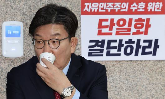 당 대선 후보 단일화 등을 촉구하며 단식 농성에 돌입한 권성동 국민의힘 원내대표가 9일 오전 서울 여의도 국회 원내대표실 앞에서 물을 마시고 있다. 뉴시스 |