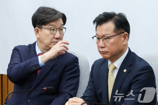 (서울=뉴스1) 안은나 기자 = 권성동 국민의힘 원내대표가 9일 오전 서울 여의도 국회에서 열린 원내대책회의에 참석해 당직자에게 물을 요구하고 있다. 오른쪽은 이양수 선관위원장. 2025.5.9/뉴스1coinlocker@news1.krCopyright ⓒ 뉴스1. All rights reserved. 무단 전재 및 재배포, AI학습 이용 금지.