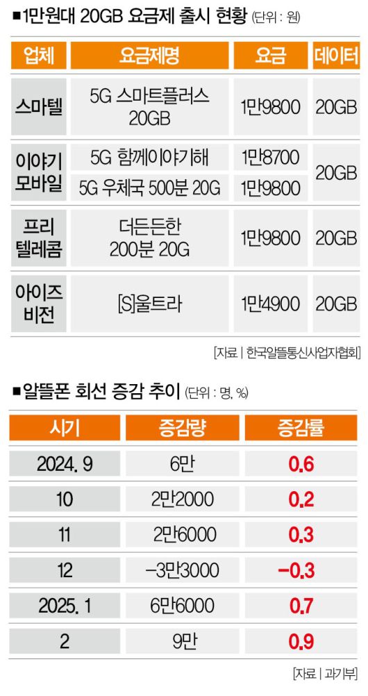 스마텔과 이야기모바일의 요금제 가격이 각각 1만9800원과 1만8700원 인만큼 요금이 2만원으로 오를 가능성이 높다. '1만원대 알뜰폰 요금제'가 과기부의 공언처럼 가계통신비를 실질적으로 떨어뜨리지 못할 것이란 지적이 나오는 이유다.
