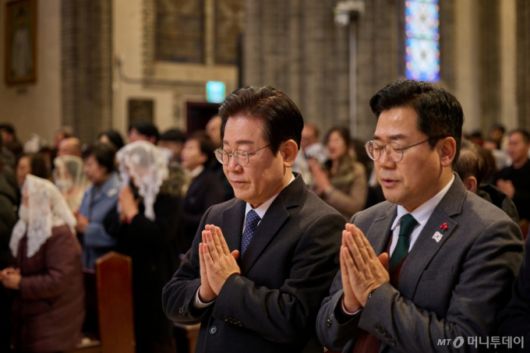 (서울=뉴스1) = 이재명 더불어민주당 대표와 박찬대 원내대표가 25일 서울 중구 명동성당에서 열린 주님 성탄 대축일 낮 미사에 참석해 기도하고 있다. (더불어민주당 제공) 2024.12.25/뉴스1 Copyright (C) 뉴스1. All rights reserved. 무단 전재 및 재배포, AI학습 이용 금지. /사진=(서울=뉴스1) |