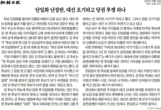 조선 = 단일화 난장판, 대선 포기하고 당권 투쟁 하나