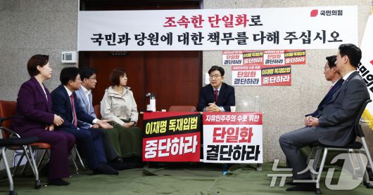 (서울=뉴스1) 김민지 기자 = 권성동 국민의힘 원내대표가 9일 오전 서울 여의도 국회에서 김문수 당 대통령 후보에게 단일화 약속을 촉구하며 무기한 단식농성을 벌이고 있는 가운데 김상훈 정책위의장, 김대식 의원 등 동료 의원들과 대화하고 있다. 2025.5.9/뉴스1