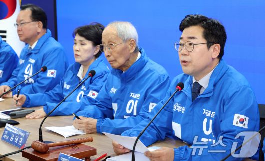(서울=뉴스1) 김명섭 기자 = 박찬대 더불어민주당 제21대 대통령 선거 총괄선거대책위원장이 9일 오전 서울 영등포구 여의도 당사에서 열린 중앙선거대책회의에서 발언을 하고 있다. 2025.5.9/뉴스1